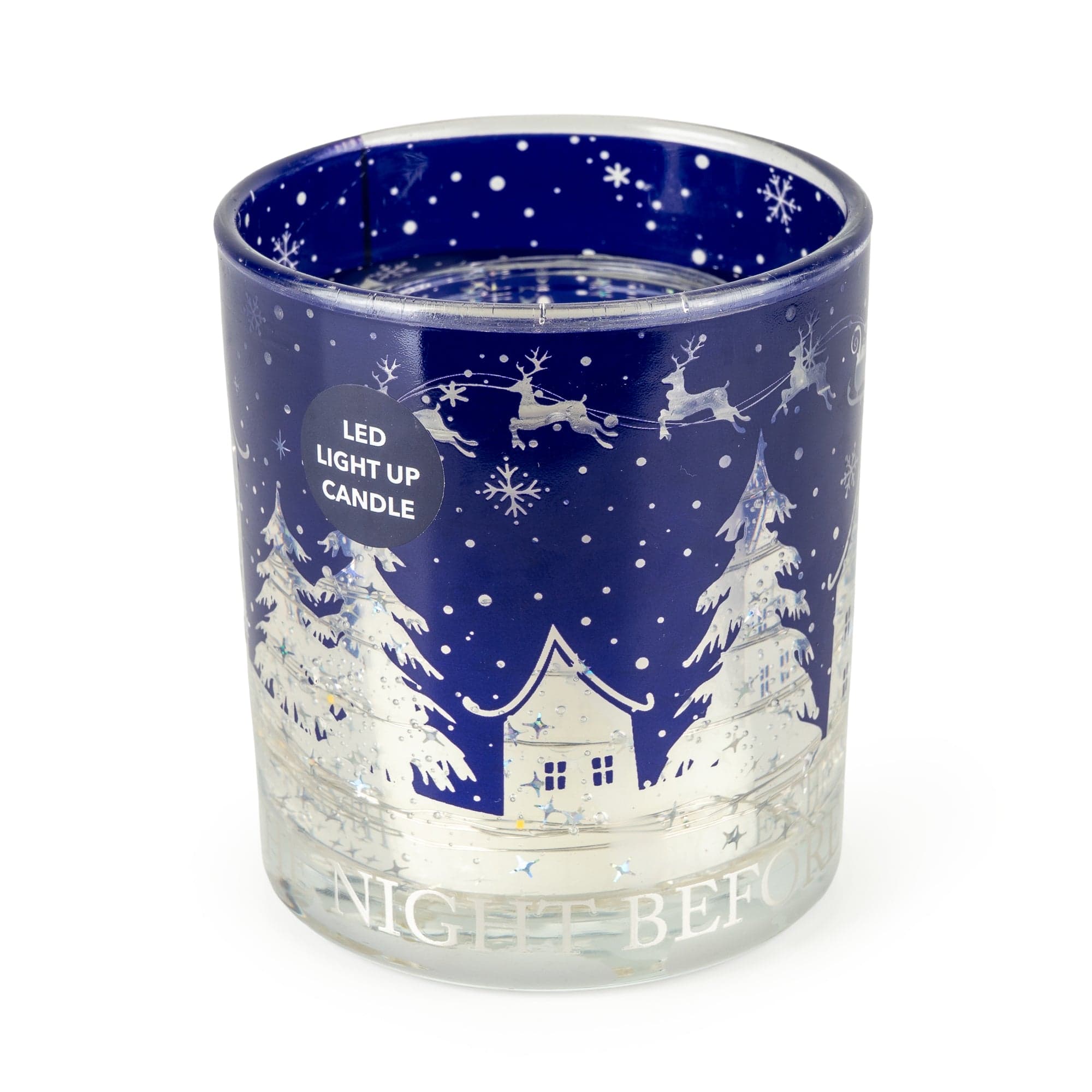 Capture the wonder of Christmas Eve with the LED Candle Night Before Christmas, featuring a midnight-blue wrap illustrated with a snow-dusted village, tall firs, and Santa’s sleigh soaring across a starry sky. The LED light activates when the candle is lit, casting a soft, twinkling glow that illuminates the silver detailing and scatters festive sparkles. Perfect for mantels, windowsills, or as a magical table centrepiece, this flameless design gives you the cosy ambience of candlelight without smoke, soot, or mess—bringing storybook charm to your seasonal décor.
