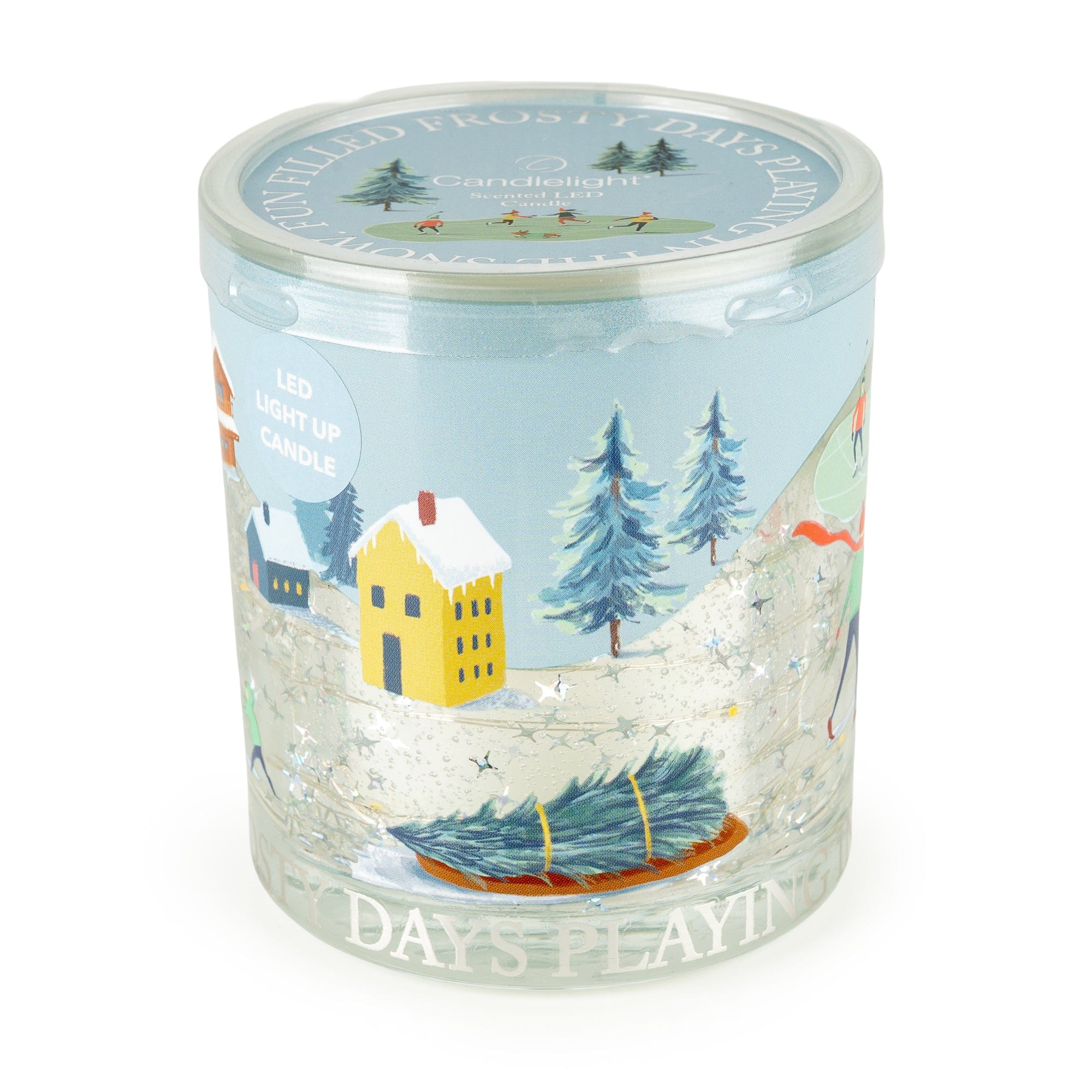 Celebrate the joy of wintry adventures with the LED Candle Snow Days, illustrated with pastel houses, towering firs, and skaters swooping across a frosty hillside while a freshly cut tree rides home on a sledge. The LED light activates when the candle is lit, illuminating silver star accents suspended in the glass to create a gentle, snow-like sparkle and a beautifully cosy glow. Perfect for mantels, windowsills, or a playful table centrepiece, this flameless design delivers the ambience of candlelight without smoke, soot, or mess—making a charming, family-friendly addition to your seasonal décor.