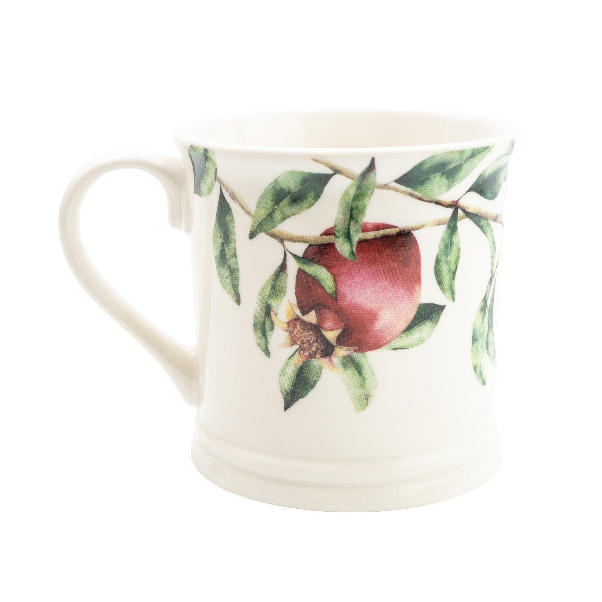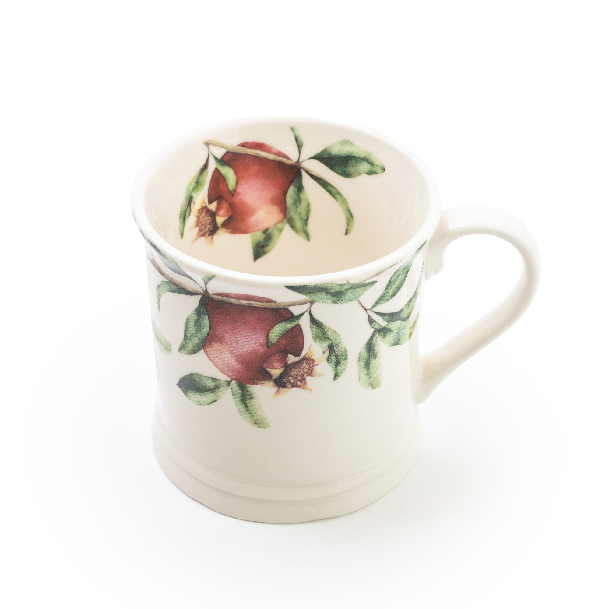 The rustic shape gives them a good, solid, sturdy feel. The beautiful Pomegranate design wraps the mug. Elegant yet with a shabby chic country style. It is beautifully giftable and has a coordinating range.